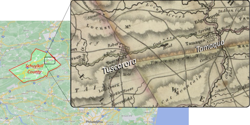 - Map – Tuscarora area – Map of Schuylkill County, Pennsylvania – Henry Schenck Tanner – 1830 –https://www.loc.gov/item/2012592199/
