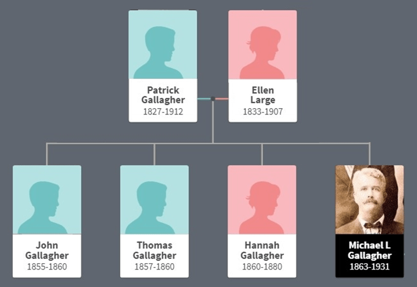 Mike was the fourth child of Patrick and Ellen Gallagher. With the death of the first two children John and Thomas, the two remaining children were Hannah and Michael.