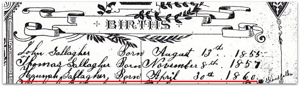 On Monday, April 30, 1860, Hannah Gallagher was born to Patrick and Ellen. She was named after Patrick’s mother Hannah Roarty. As with her other childbirths, Ellen had help from her sister Margaret and her mother Bridget. And like those other births, I’ll bet Patrick couldn’t miss work.