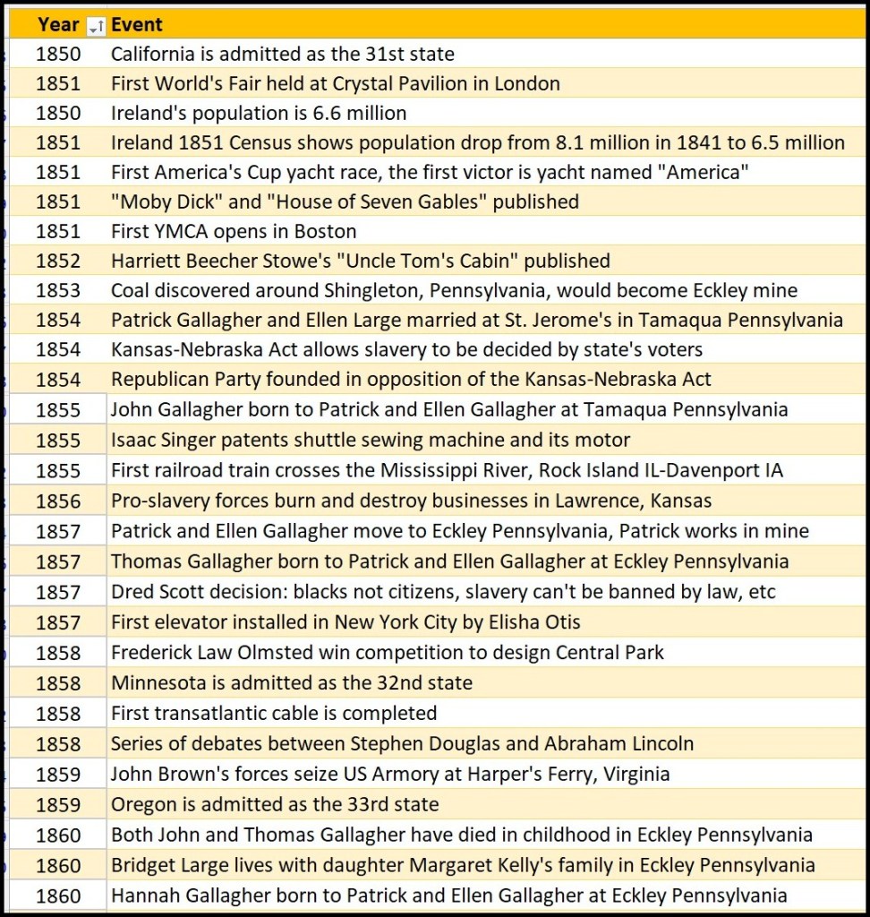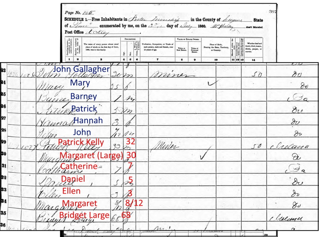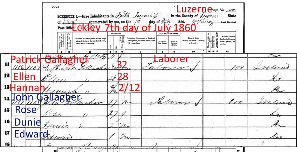 The 1860 census shows Patrick and Ellen Gallagher’s family in Eckley. Patrick, 32, was a mine laborer. Ellen was age 28. Neither could read or write. Their daughter Hannah was two months old, having been born April 30.