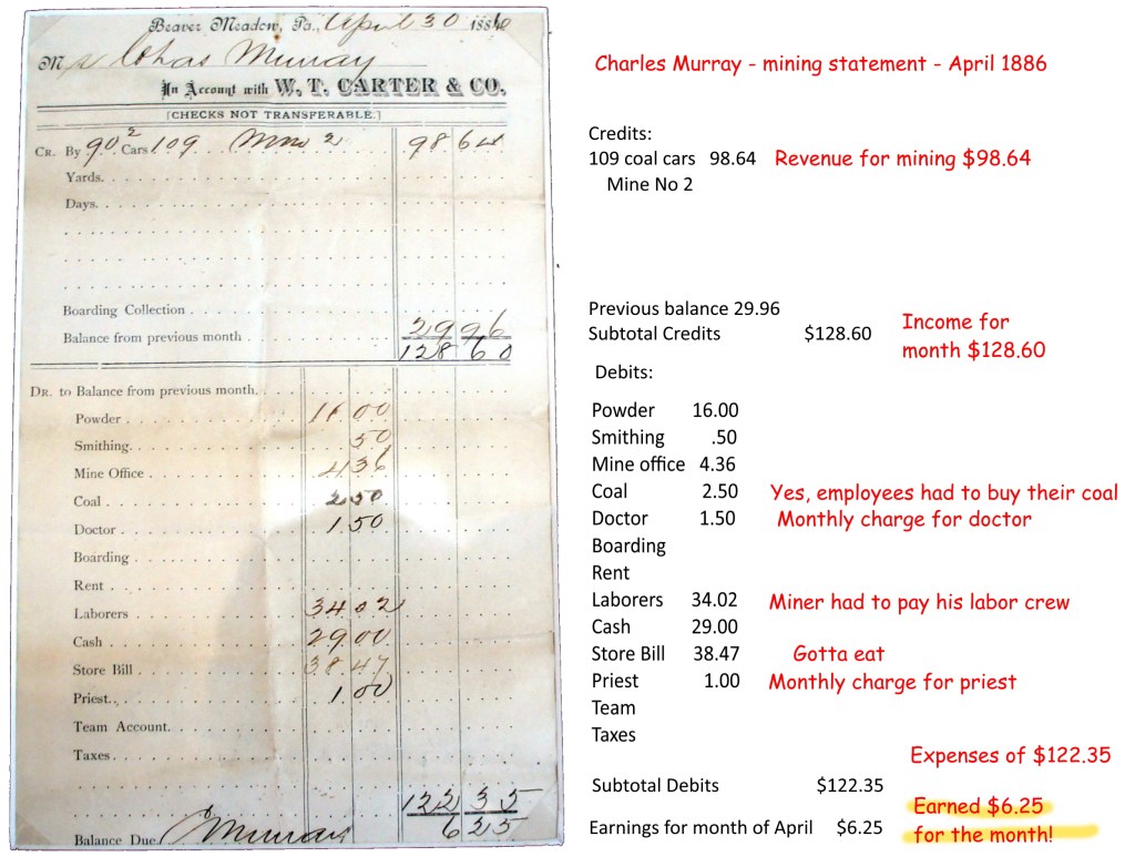 Miners had to pay their labor crews and expenses. Here’s an example for Charles Murray for April 1886. His net income for the month was $6.25.