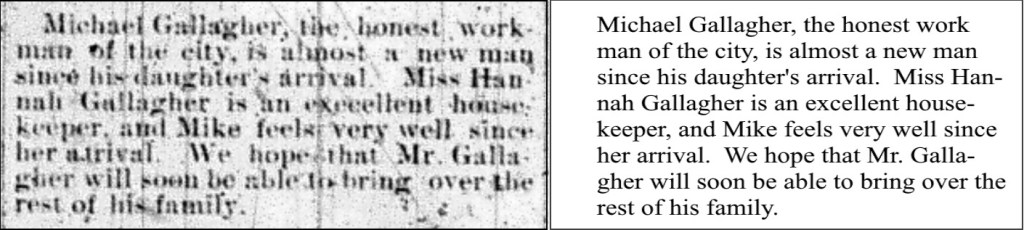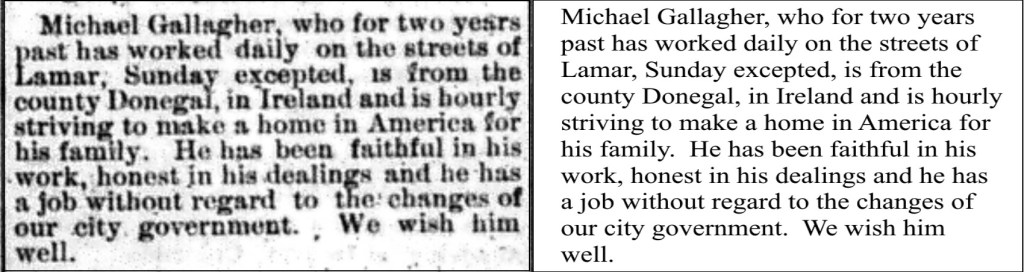 Who is this Michael Gallagher? He’s not our Michael, son of Patrick and Ellen. And this Michael has a daughter Hannah. She’s not our Hannah, daughter of Pat and Ellen who died in 1880. And she’s just arrived in Lamar.