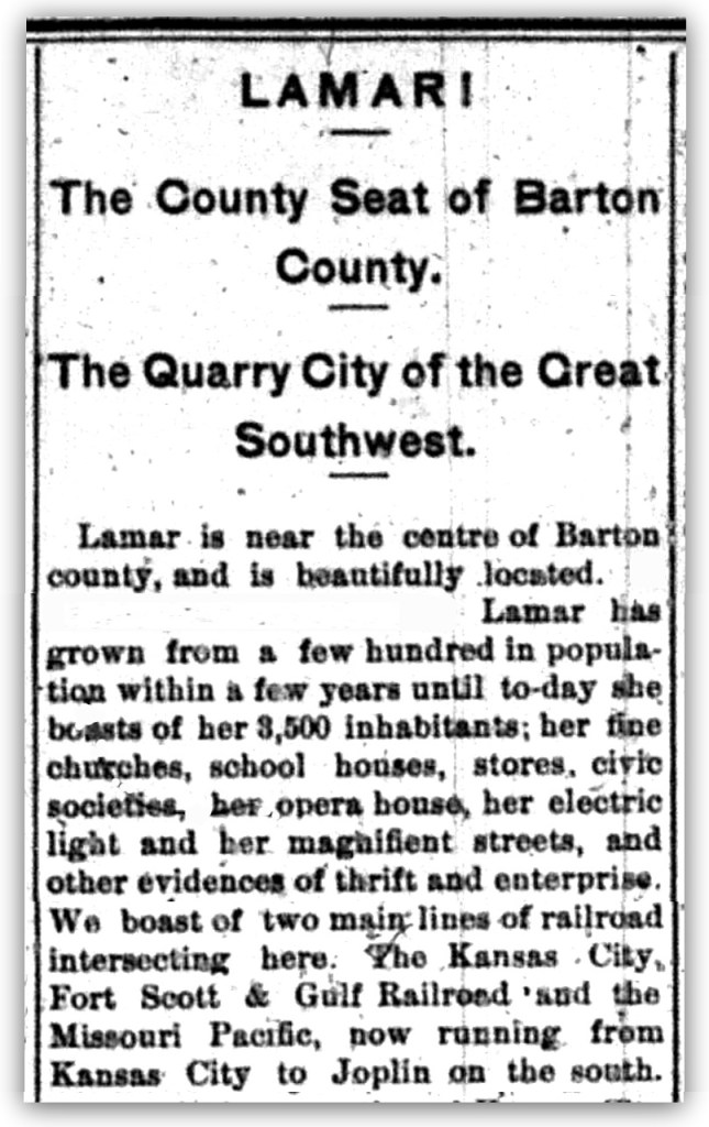 The town of Lamar had grown into a bustling city of 3,500. It was the county seat of Barton County. Its amenities rivaled other regional cities.