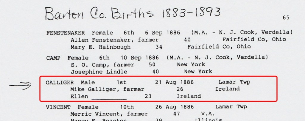- Image – John Gallagher’s Birth – Barton County Births – 1883-1894 – Clerk of the County Court – Barton County, Missouri – Lamar, Missouri
