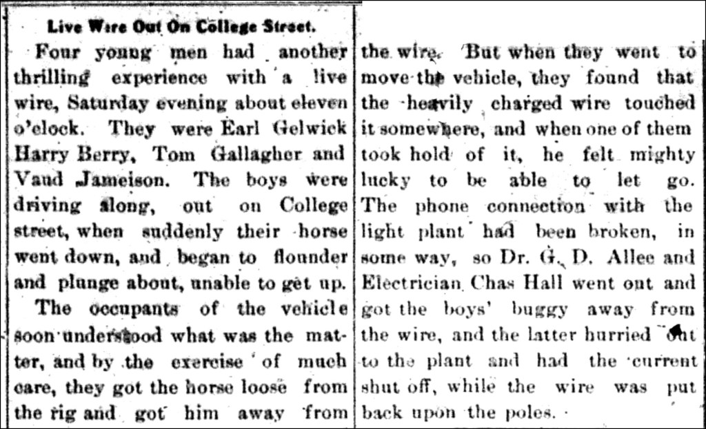 In 1910, Tom and his friends had a harrowing experience when the horse pulling their buggy got tangled in a downed electric wire.