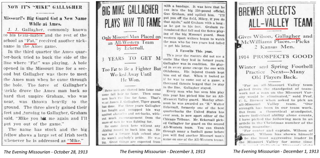 - News articles – Jim Gallagher – engineering and football at University of Missouri – The Evening Missourian – various dates – Newspapers.com