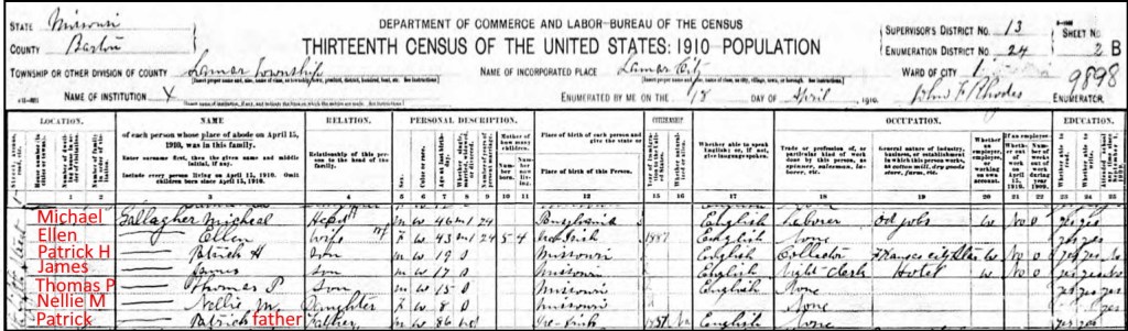 - Census – 1910 Census – Michael and Ellen Gallagher – Ancestry.com – https://www.ancestry.com/imageviewer/collections/7884/images/31111_4330350-01126?pId=14123353