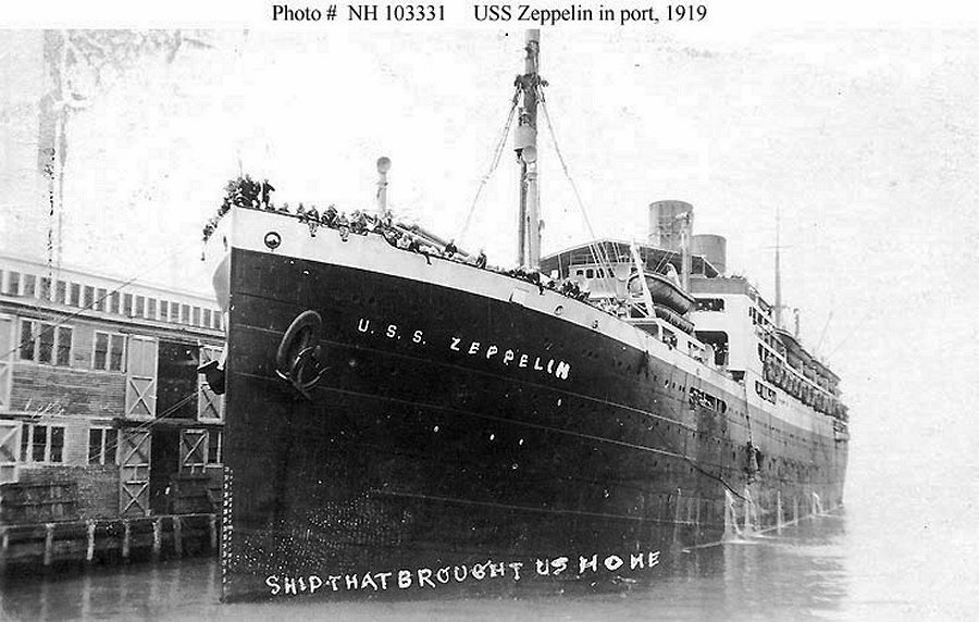 Friday the thirteenth is not a bad date. At any rate, June wore along, and on the 13th, which was Friday, the longed-for orders arrived. The transport Zeppelin was designated as the ship aboard which the Bearcats would journey homeward. Zeppelin was a German passenger ship given to the Allies in March 1919 as part of war reparations, and re-christened USS Zeppelin. It began duty transporting American troops home.