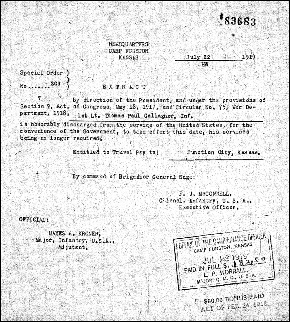 On July 22, 1919, Tom Gallagher received his discharge from United States military service.