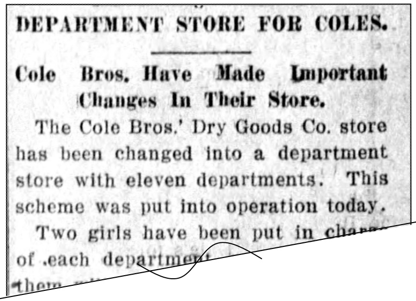 While visiting their parents in Lamar, Tom and Henry shared some confidential news. Cole’s was going to open a store in Sedalia, Missouri, and Henry and Tom were going to manage it.