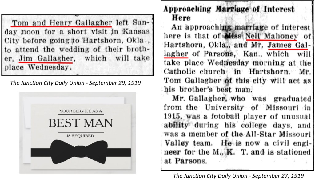 Earlier in 1919, Henry Gallagher and three other single gents had set themselves up in a bachelor quarters in the Montgomery apartments at 108 West First Street in Junction City. They even employed a cook to take charge of the kitchen. Henry’s roommates were Ed Rolfs, Walter Whitney, and Albert Gable.