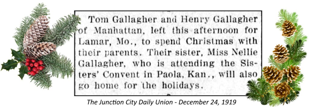 By the end of December, the brothers were looking forward to visiting family in Missouri. They would join sister Nellie, who was in school at the convent in Paola, and all three would go to Lamar to spend Christmas with their parents.