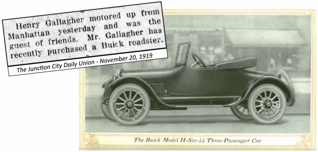 Tom had owned a 1918 Ford Model T, but had sold it when he was in military service. Now, in 1919, Henry had purchased a Buick roadster. Since many of Henry’s social acquaintances were in Junction City, he often motored there from Manhattan for social visits.