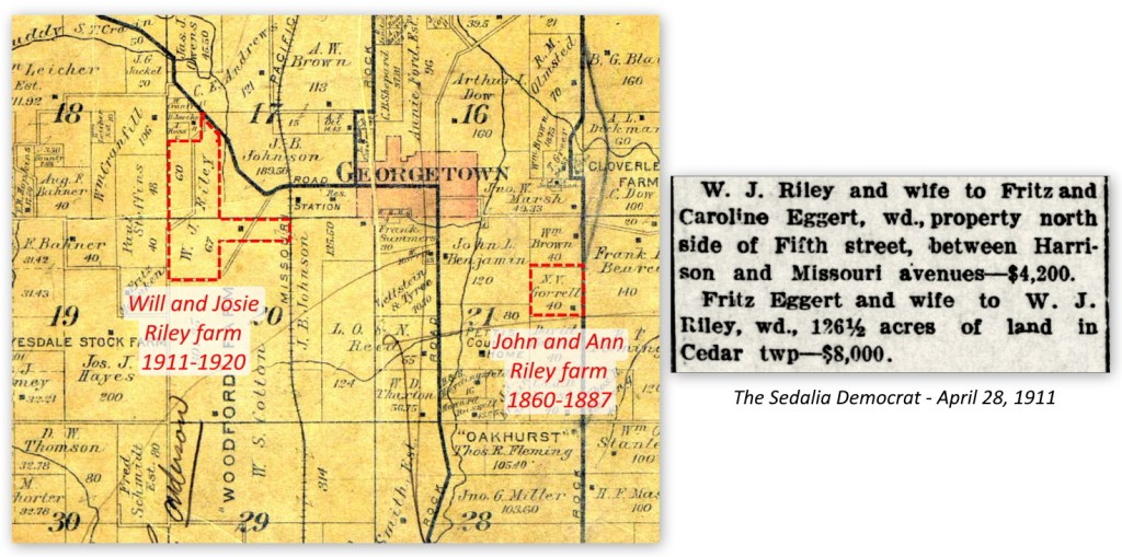 In 1911, Will and Josie Riley had traded their rental house at 616 West Fifth Street in Sedalia for a 126-acre farm on the west side of Georgetown. The farm was only a few miles from John and Ann Riley’s farm where Will grew up. There was a resident tenant farmer, W.A. Haeslip.