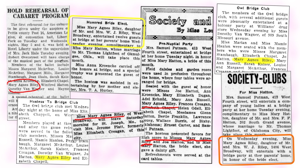 Mary Agnes Riley loved and lived the social scene of Sedalia. She was a great bridge player, entertained and was entertained, and traveled occasionally to visit out-of-town friends and relatives.