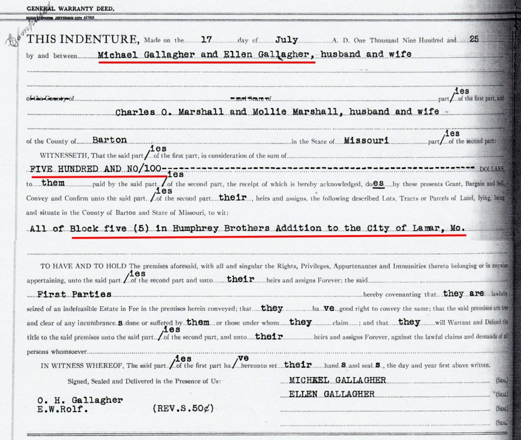 - Deed – Michael and Ellen Gallagher to Charles and Mollie Marshall – Block 5 – Humphrey Brothers Addition to City of Lamar, Missouri – 1925 – Register of Deeds – Barton County, Missouri – Lamar, Missouri