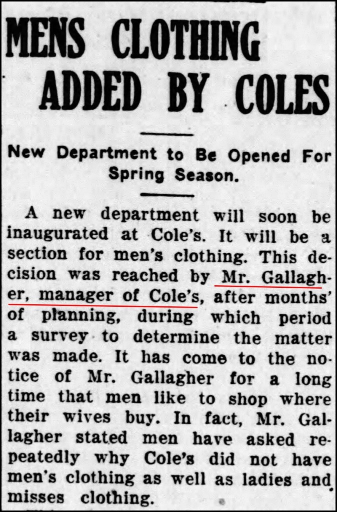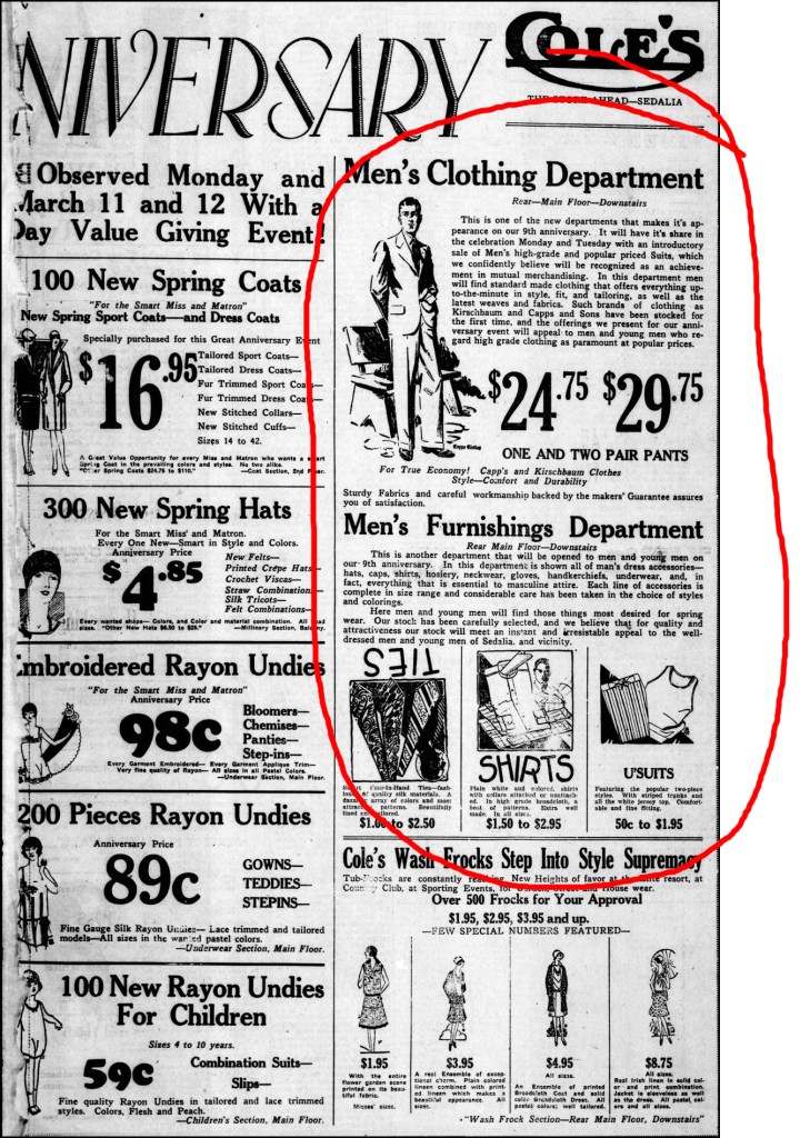 As it had done every year since 1920, Cole’s Women’s Shop celebrated the anniversary of their Sedalia store opening. 1929’s celebration was unique, because the store had just added men’s clothing to its lineup.