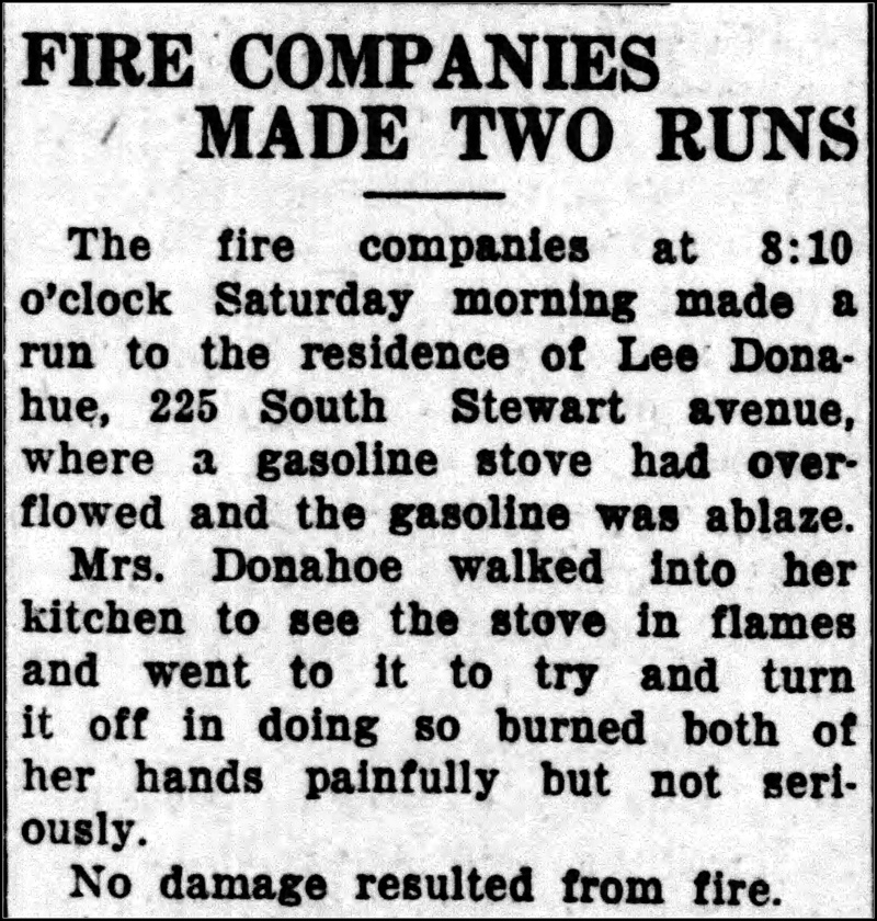 While her parents were visiting for the summer, Nell’s gasoline stove overflowed and caught fire. A quick response by the Sedalia fire department extinguished the flames.