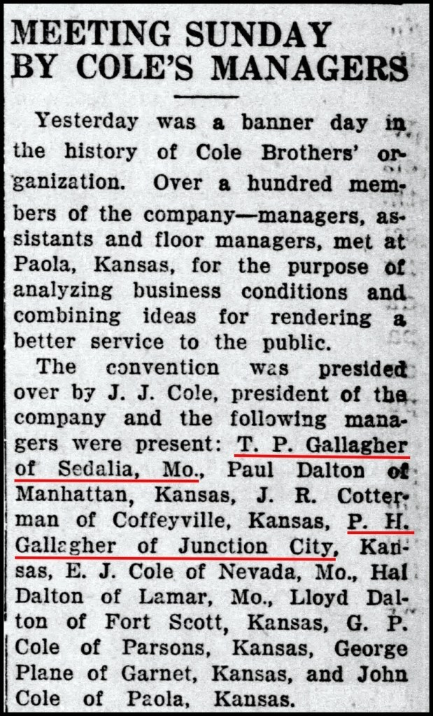 On October 6, 1929, Cole’s hosted the largest manager’s meeting in their history, with over 100 people attending the extravaganza in Paola, Kansas. Little did the Cole’s managers know that a cataclysmic economic event was just two weeks away.