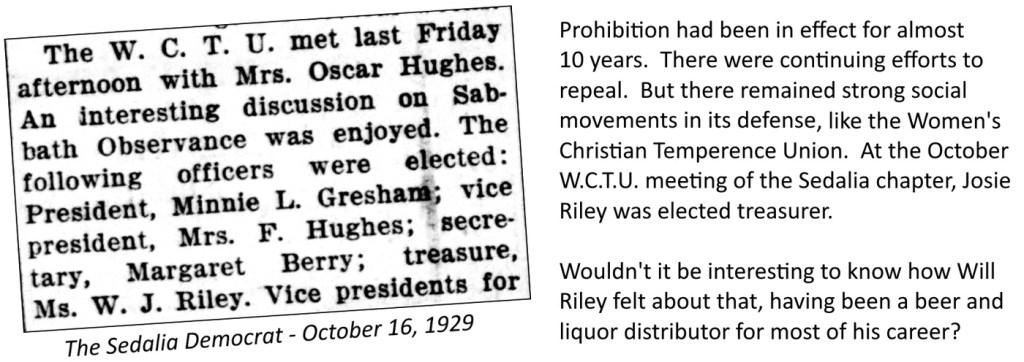Will Riley continued his insurance sales. Of course, the Riley’s lifestyle wasn’t as good as before prohibition, but that had been a long nine years in the past.