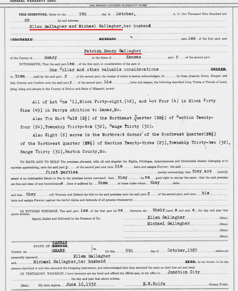 In fact, on October 9, 1929, Mike and Ellen Gallagher deeded their Lamar, Missouri properties to Henry.
