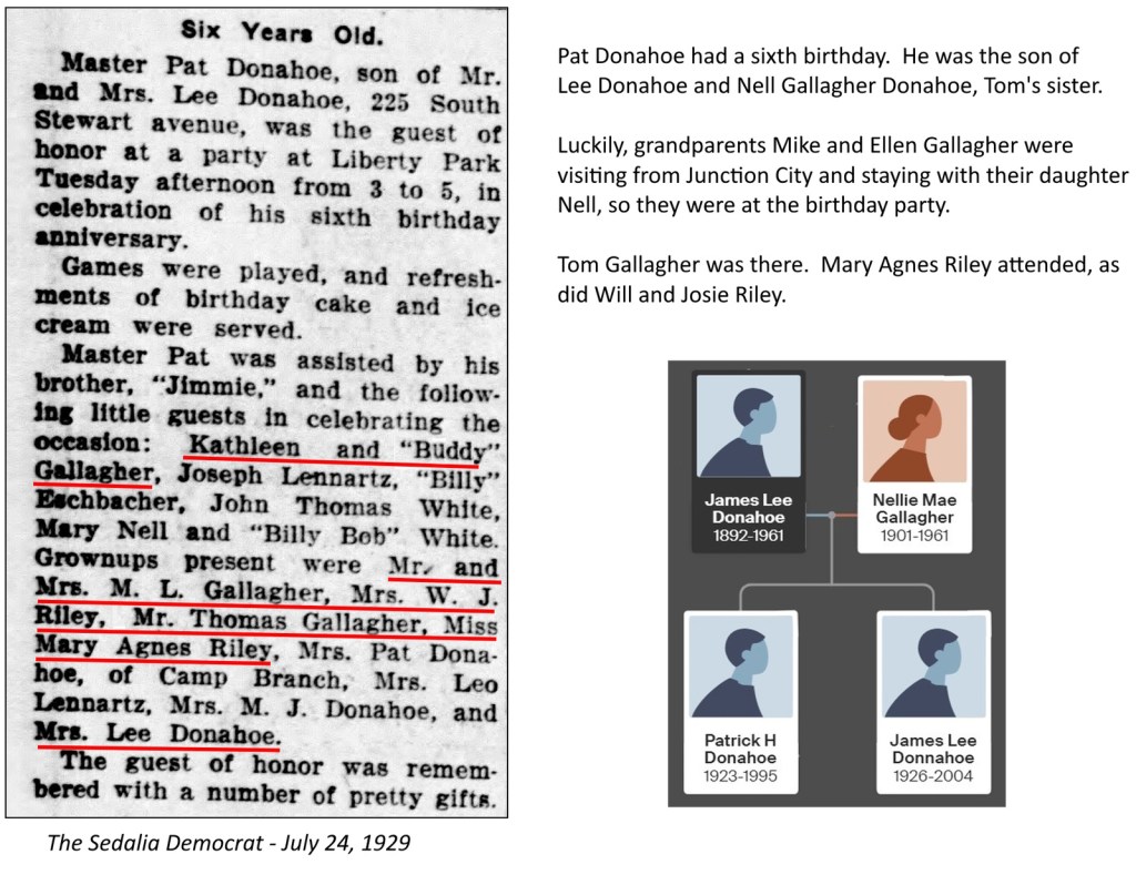 Eb and Tommy Hurley were children of Tom and Irene Riley Hurley. Jean, Joanne, and Joe Riley were children of Joe and Emeline Staats Riley. And, of course, Buddy and Kathleen were children of Tom and Catherine Riley Gallagher.