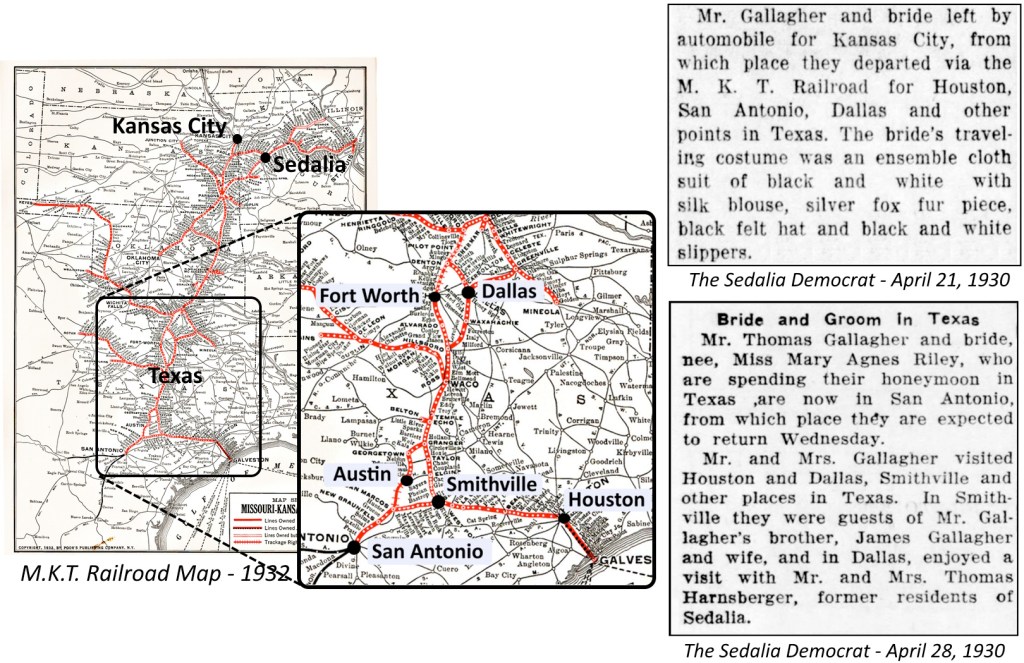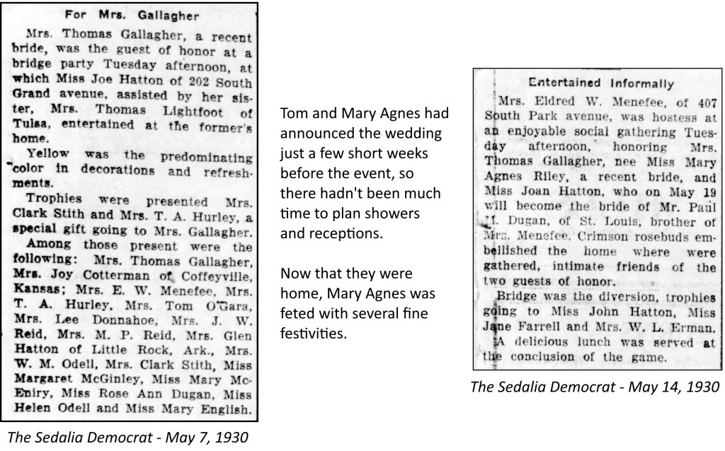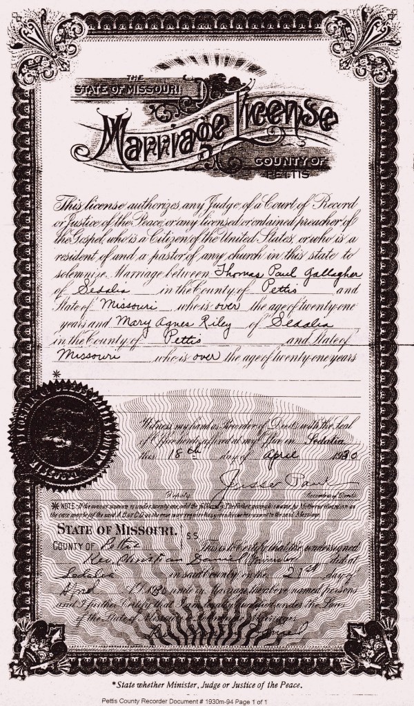 - Marriage License – Tom Gallagher and Mary Agnes Riley – April 18, 1930 – Pettis County, Missouri Recorder of Deeds – Sedalia, Missouri