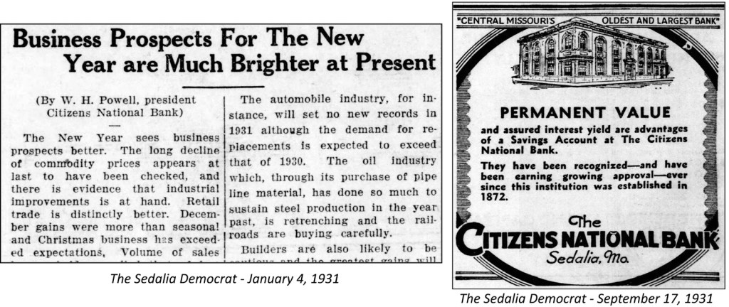 Citizens National Bank was one of the oldest and most prestigious in Sedalia. Early in 1931, W.H. Powell, bank president, had written an op-ed stating that business prospects for the new year were brighter.