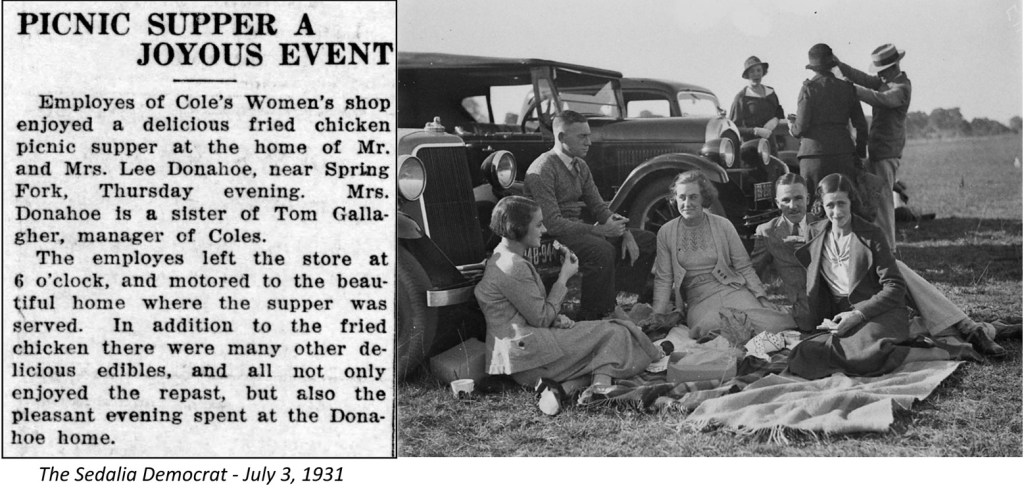 Tom Gallagher and Cole’s sponsored an annual employee picnic. In 1931, the picnic was hosted by Tom’s sister Nell Donahoe at her farm at Spring Fork, just a few miles south of Sedalia.