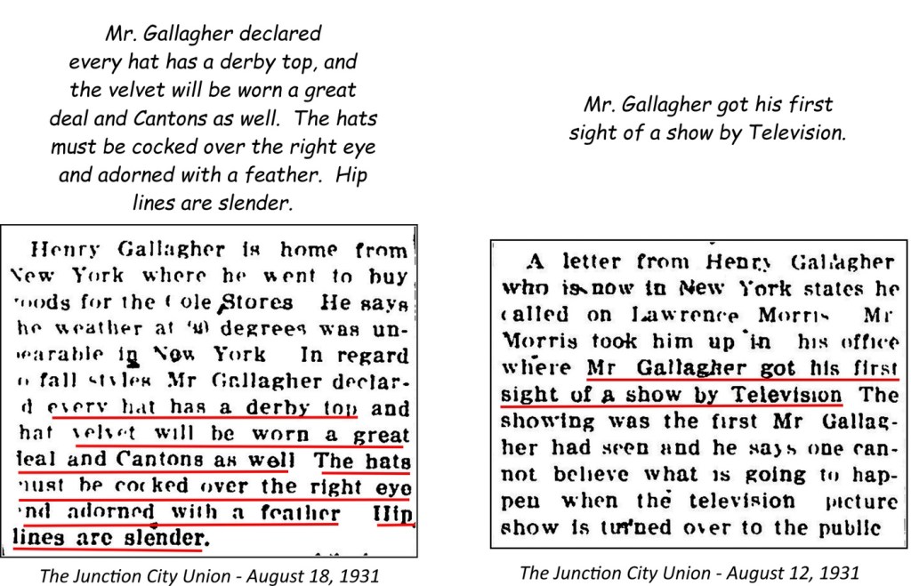 Tom and Mary Agnes Gallagher and children visited Junction City often. Tom had lived in Junction for several years before opening the Sedalia store, and still had many friends and acquaintances there in addition to his parents and brother.