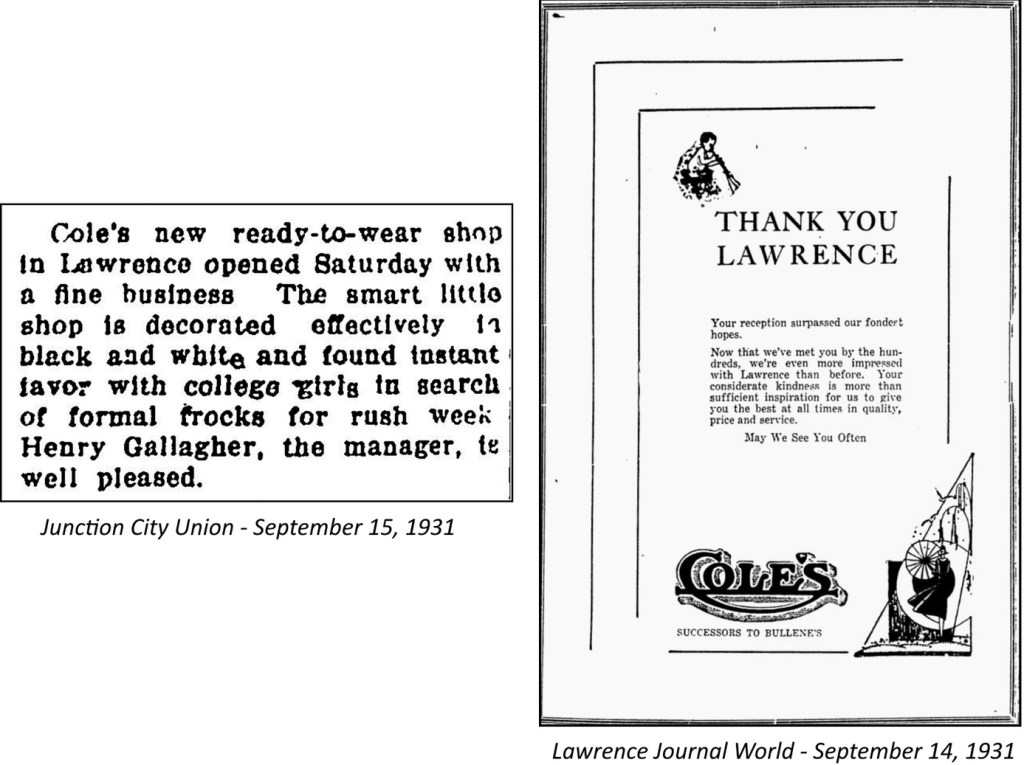 Henry took the assignment. He moved to Lawrence and rented an apartment at 1900-1/2 Louisiana Street above a dairy store. He opened Cole’s Ready To Wear at 815 Massachusetts Street.