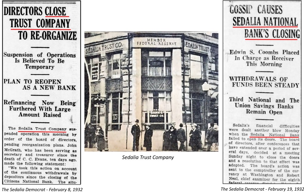 In Sedalia, Citizens National Bank had failed. That caused nervous depositors to withdraw their funds from other banks in town while they still could. The surge of withdrawals caused two more banks to close in February, Sedalia Trust Company and Sedalia National Bank.