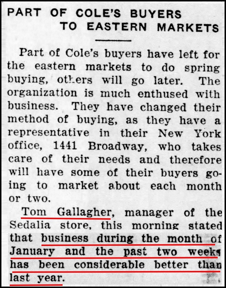Somehow Cole’s continued to survive. In February 1932, Tom Gallagher reported to the Sedalia Democrat that sales were better than the previous year. He also reported that Cole’s had joined a cooperative that would improve their purchasing power and choices.