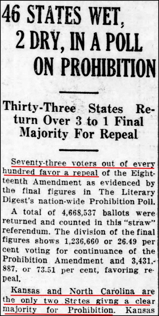 Now, after a decade, public sentiment was overwhelmingly in favor of repealing the 18th amendment. In one national poll, only Kansas and North Carolina favored keeping Prohibition.