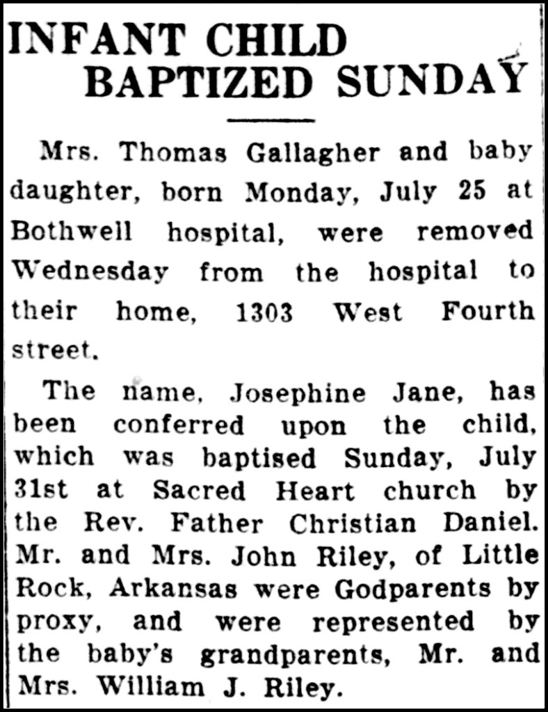 A week in the hospital was normal. Mary Agnes and her new baby Jane were released so that Jane could be baptized on Sunday, July 31. Reverend Christian Daniel presided. Will and Josie Riley represented John and Vera Riley as godparents at the baptism.