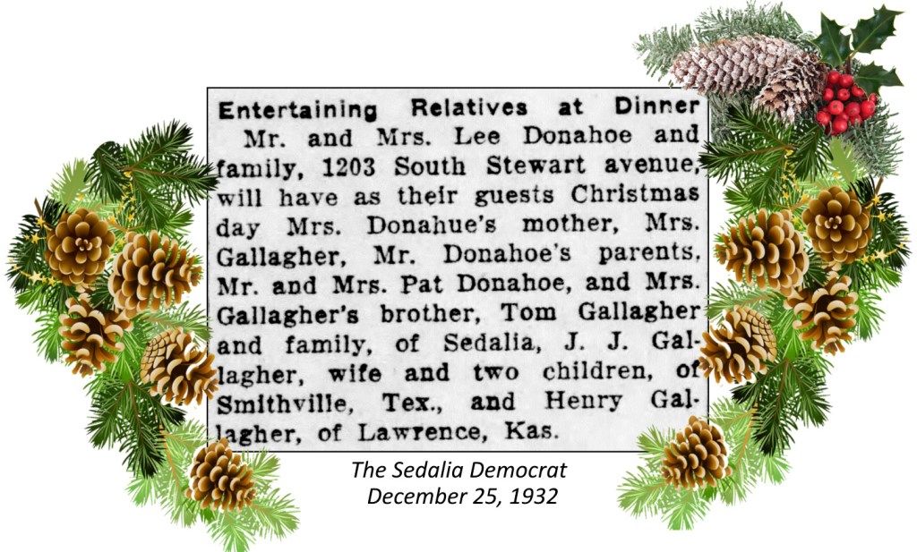 1932 was the first year of many that the Gallagher family was all together. Lee and Nell Gallagher Donahoe hosted Christmas at their home in Sedalia. Tom and Mary Agnes Gallagher and children from Sedalia were there. Jim and Nell Gallagher and family from Smithville, Texas were present. Mother Ellen Dugan Gallagher was there, as was brother Henry Gallagher from Lawrence.