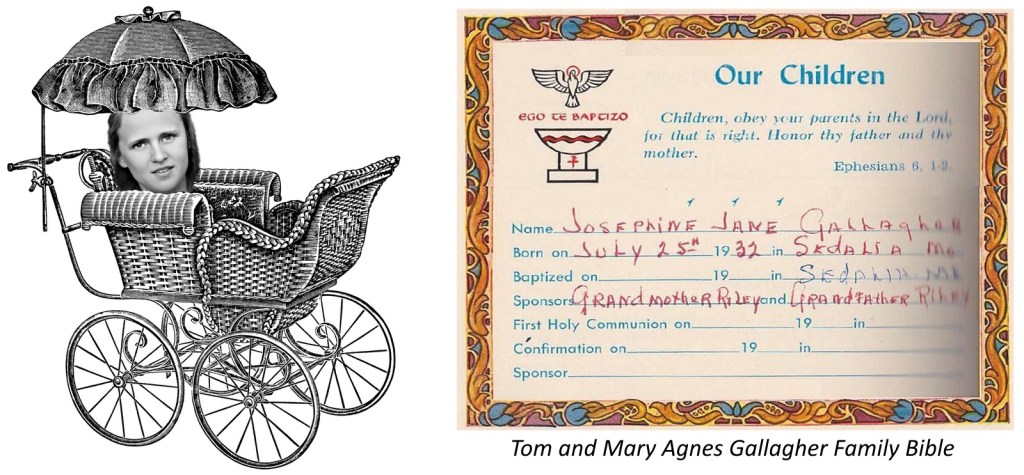 Josephine Jane Gallagher was born at 11:20 am on Monday, July 25, 1932. The name Josephine honored her grandmother, Josephine Pensa Riley, Mama Riley.