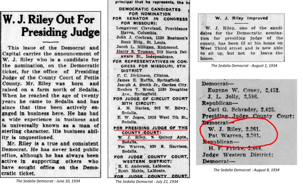 Will Riley had always been involved in local politics. Now, in 1934, he ran for Presiding Judge. Unfortunately, he was ill for much of the campaign season. Will had suffered many bouts of illness in recent years.