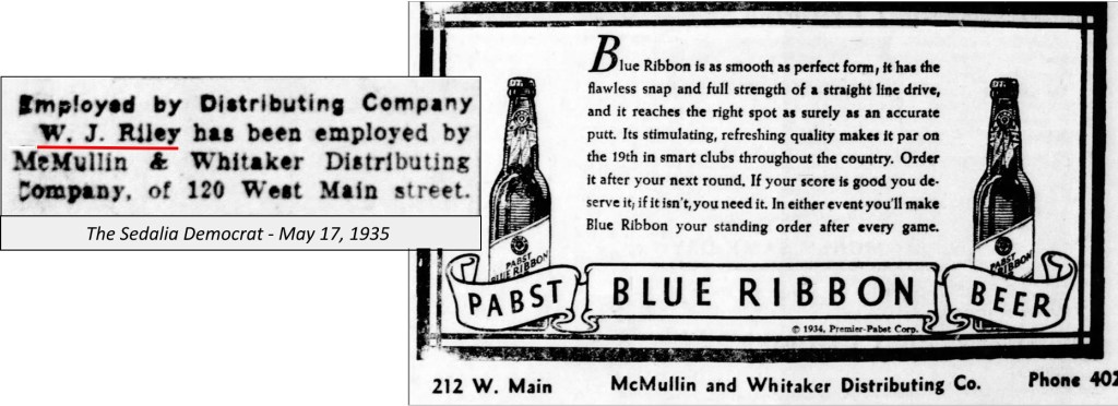 Will Riley, no longer in the insurance business, and after the demise of Sedalia Distributing, took a job with McMullin and Whitaker Distributing. They were the distributor for Pabst Blue Ribbon.