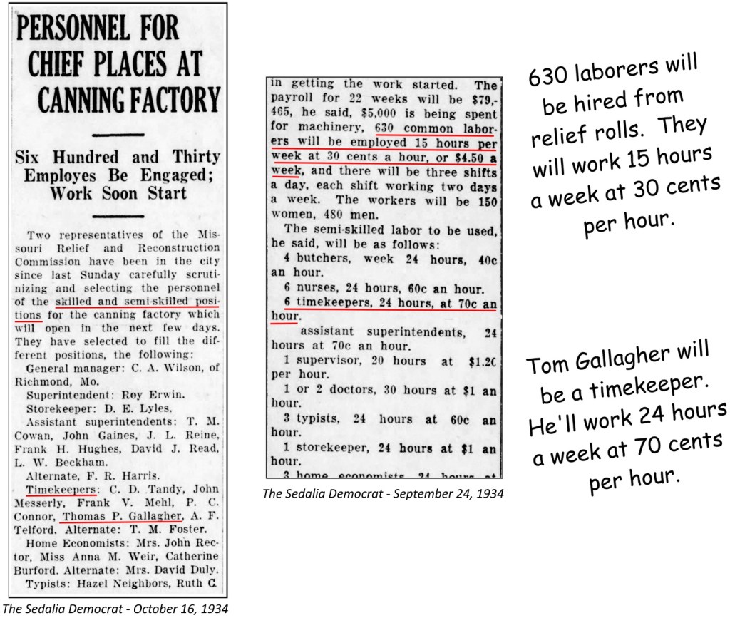 Tom was hired as one of six timekeepers. Timekeepers would work 24 hours per week at 70 cents per hour. Their weekly wage would total $16.80. Cannery laborers would work 15 hours per week at 30 cents, for a total $4.50 per week.