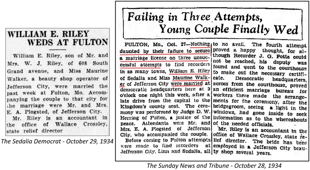 Will Riley Jr. married Maurine Walker October 23, 1934.