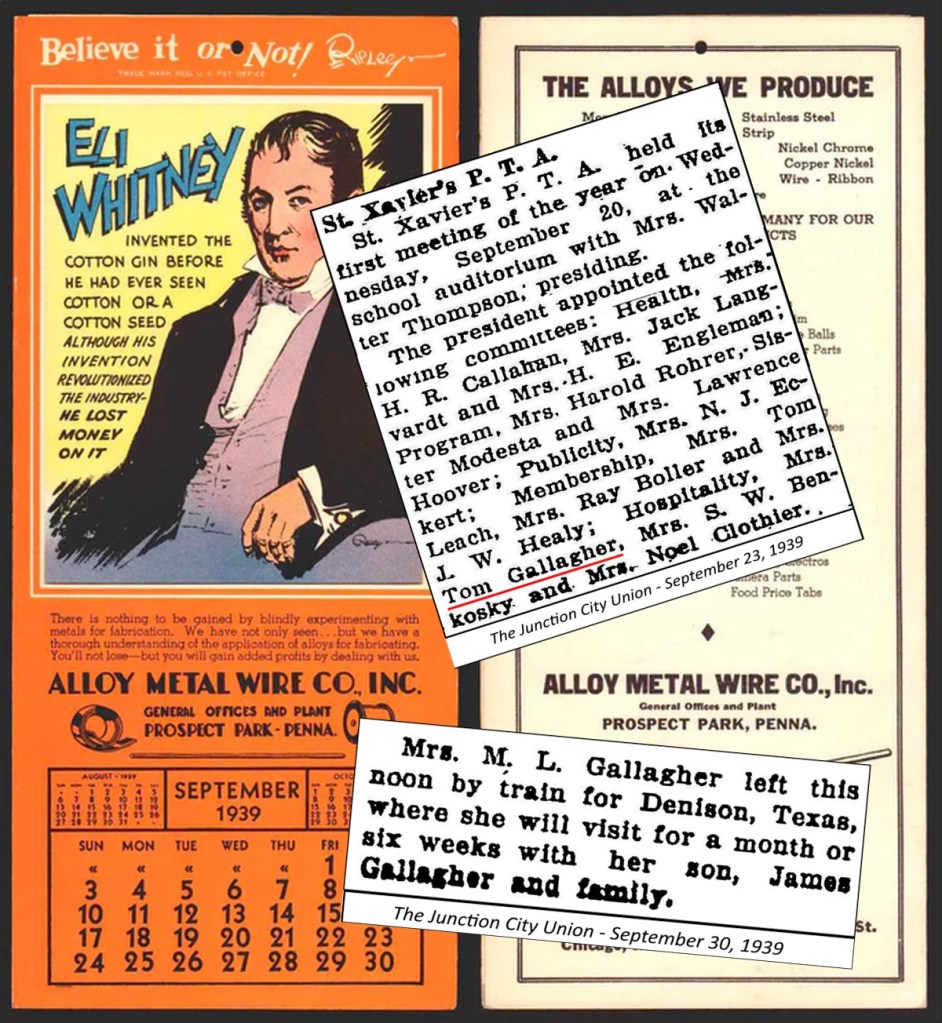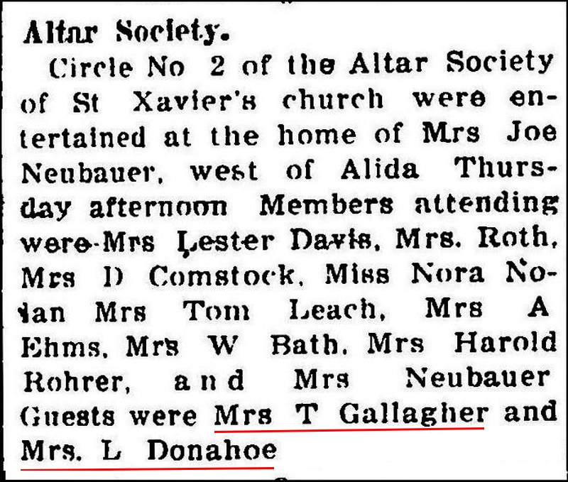 Shortly after Henry and Tom were in Manhattan on business, we find Mary Agnes Gallagher as a member of the altar society of St. Xavier’s Church, Junction City. Junction City, not Sedalia. What happened?