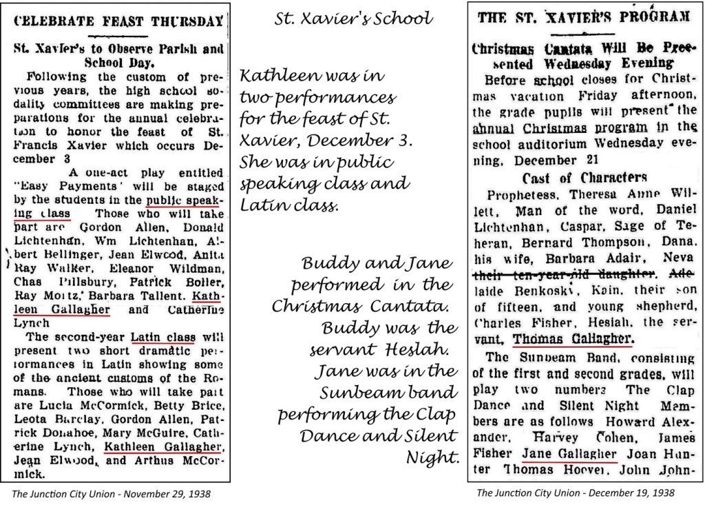 Kathleen, Buddy, and Jane enrolled at St. Xavier’s Catholic School in Junction City. By year end 1938 they were ensconced in their new school and had made new friends.