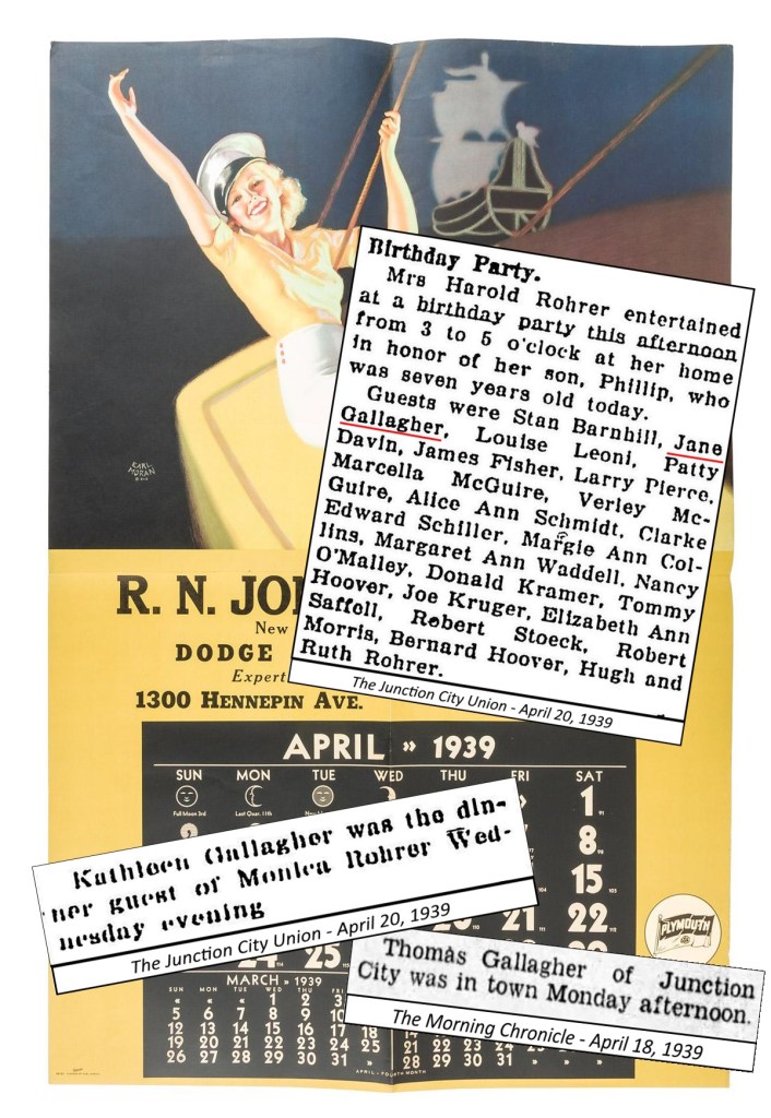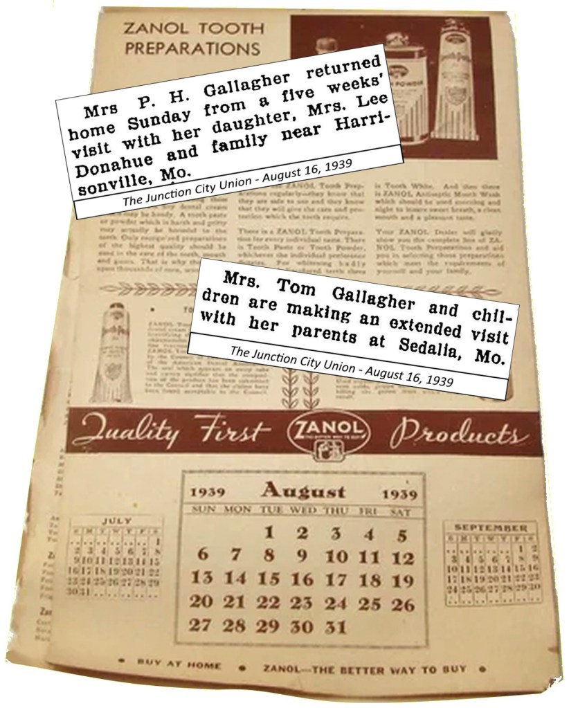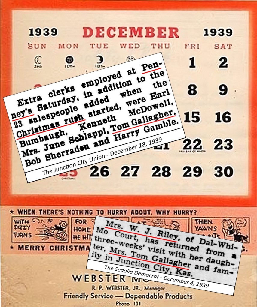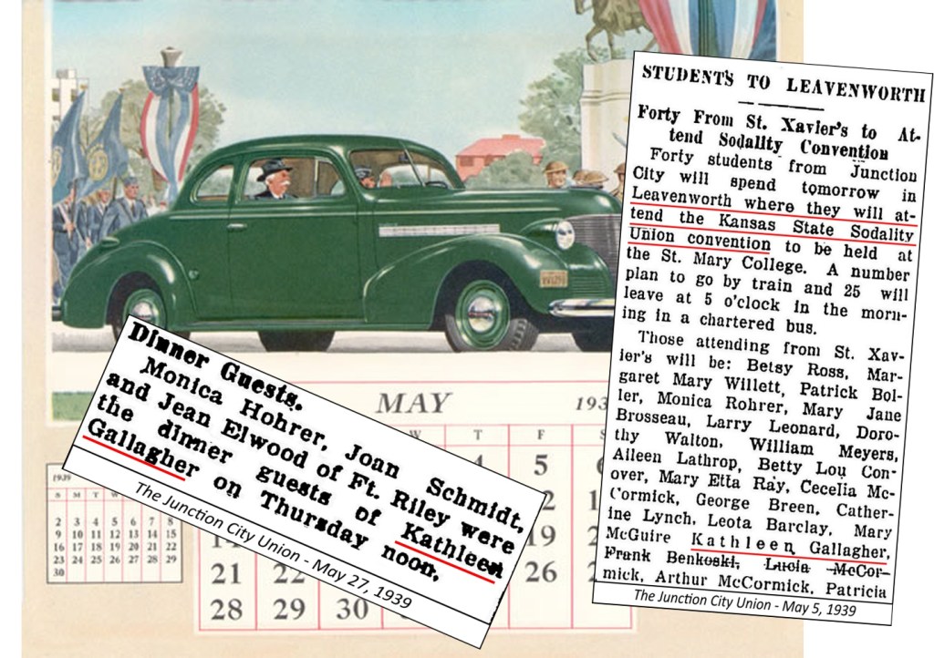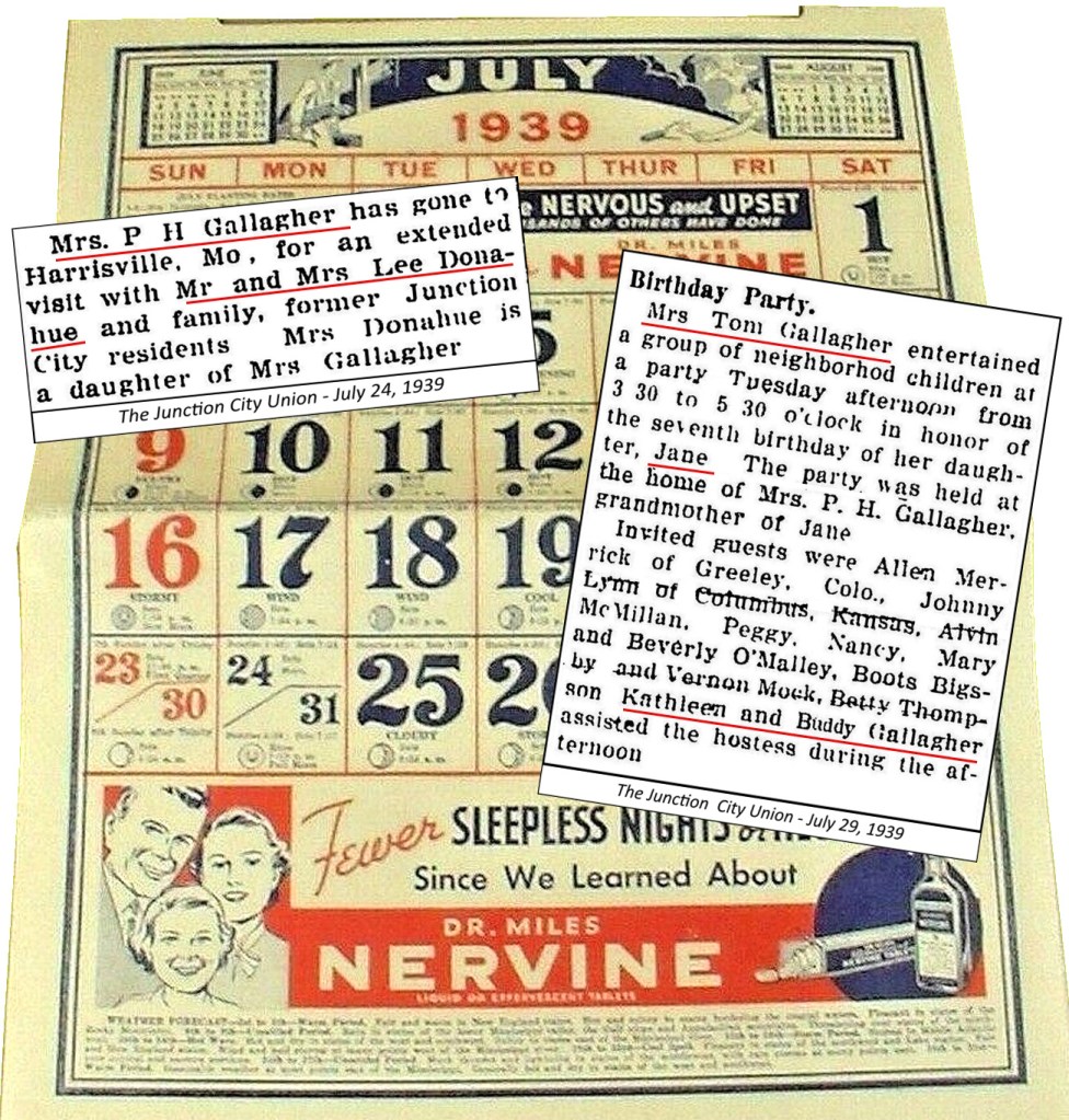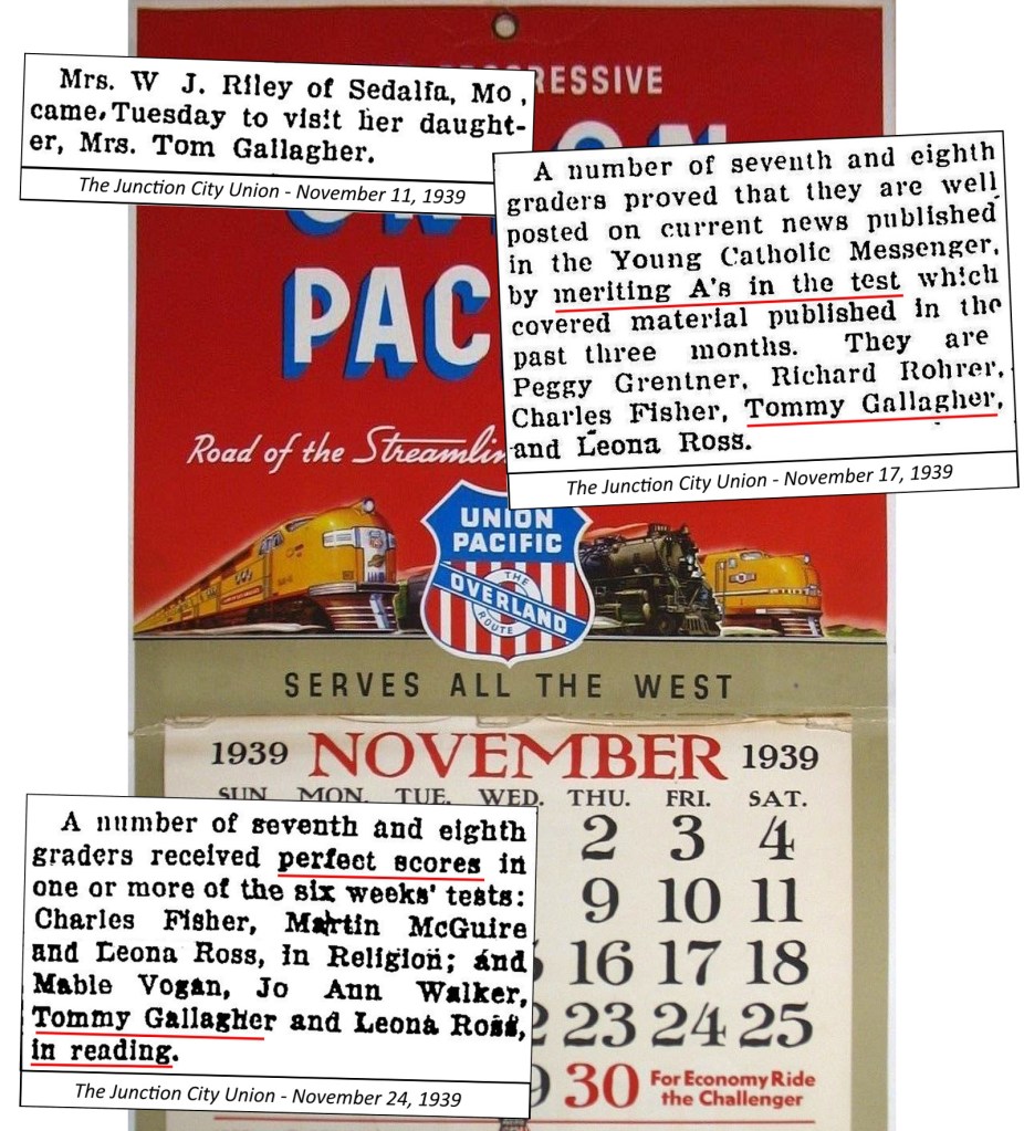 The newspapers have reported on birthday parties, illnesses, and trips. The papers cover births, marriages, and deaths. But they’re silent on the fact that Tom and Mary Agnes Gallagher and their children moved from Sedalia, Missouri to Junction City, Kansas in the summer of 1938.