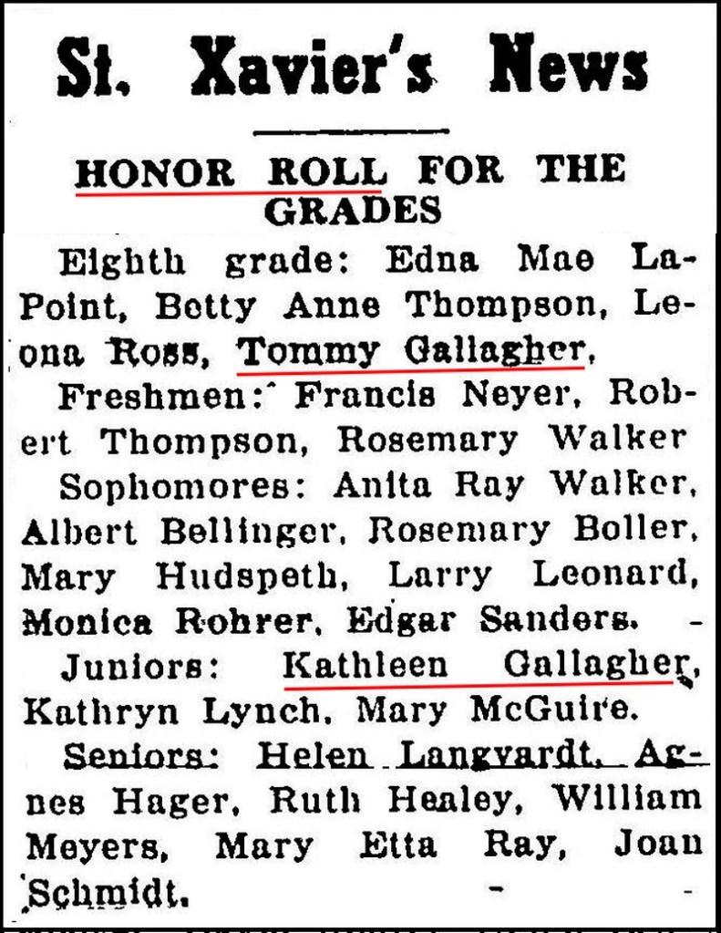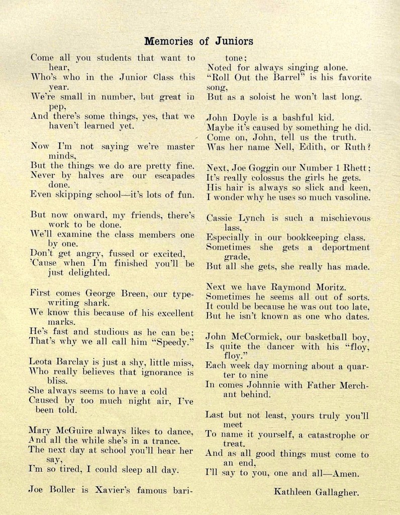 The St. Xavierian yearbook for 1939/1940 hosted a poem for each class. Kathleen Gallagher wrote the Junior Class poem.