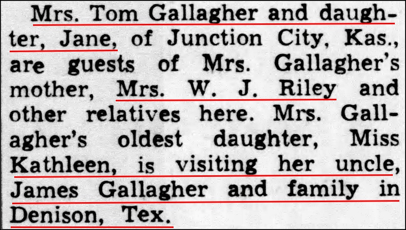Meanwhile, Kathleen Gallagher headed south to Denison, Texas for the summer. She stayed with her aunt and uncle Nell and Jim Gallagher, and her cousins Jimmy and Helen. Helen, 14, and Kathleen, 16, were cousins, but also good friends.