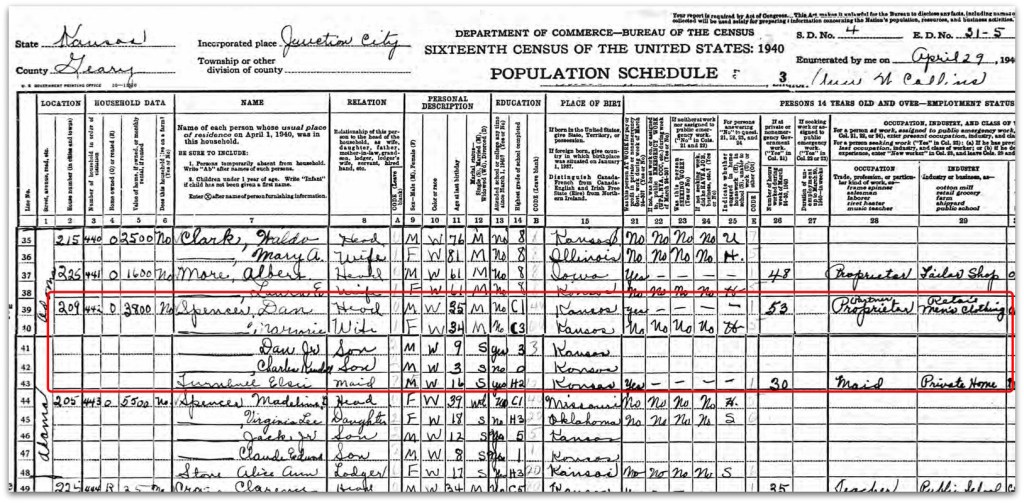 In the 1940 census, Dan and Marjorie Spencer lived at 209 Adams Street in Junction City. Their two sons were Dan Jr., age 9, and Charles Kendall, age 3. Dan was age 35 and Marjorie 34.