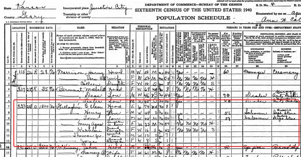 In the 1940 census, Tom and Mary Agnes Gallagher and their children lived with Henry Gallagher at 333 West Second Street in Junction City. Grandma Ellen Gallagher lived there too. Tom was age 45 and Mary Agnes 35. Henry was age 49, Ellen was 74. Kathleen was age 16, Buddy 13, and Jane 8.