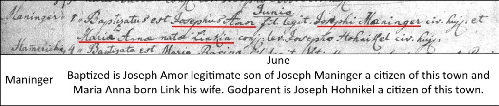 Amor Maninger was the fourth child of Joseph and Maria Anna Maninger. He was born in Dittwar a day or two before being baptized on June 1, 1797. He was 9 years old when the Holy Roman Empire dissolved.