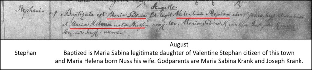 - Baptism record – Maria Sabina Stephan – Dittwar – Catholic records from the Archdiocese of Freiburg im Breisgau, Baden, Germany. Baptism, marriage and burial records included – FamilySearch – https://www.familysearch.org/ark:/61903/1:1:QB6D-QK6Z